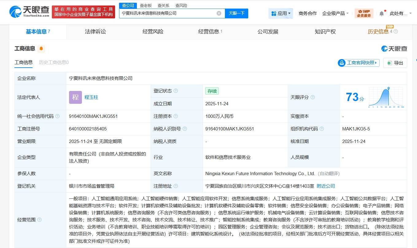 据企业信息查询平台天眼查披露,一家名为宁夏科讯未来信息科技有限公司的新企业完成工商注册登记。该企业法定代表人为程玉柱,注册资本达1000万元人民币,由科大讯飞(证券代码002230)全资控股。