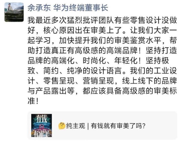 在反思的同时,余承东特别强调审美能力对品牌建设的重要性。他呼吁团队成员通过系统学习提升美学素养,将"高级感"作为贯穿产品设计、零售展示、营销传播等全链条的核心标准。这位管理者明确指出,从工业设计到线上线下品牌露出,每个环节都需要建立统一的审美体系。