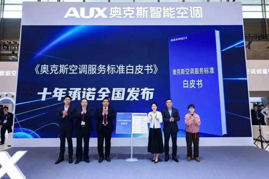 AWE现场,奥克斯在中国家电服务维修协会、国家市场监督管理总局等机构的见证下,郑重承诺自2026年1月1日起,全系分体空调实行“整机十年包修”服务,并发布《奥克斯空调服务标准白皮书》。
