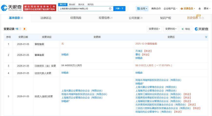 近日,上海奇算光启信息技术有限公司完成新一轮工商变更,注册资本从约84.4万元增至约99.5万元,同时引入多家知名投资机构作为新股东。新增股东包括百度旗下三亚百川致新私募股权投资基金合伙企业(有限合伙)、上海张江燧玥创业投资合伙企业(有限合伙)以及无锡高瓴祯泰股权投资合伙企业(有限合伙)。此次变更后,公司股东结构进一步多元化,涵盖创始团队、企业管理合伙企业及多家战略投资者。