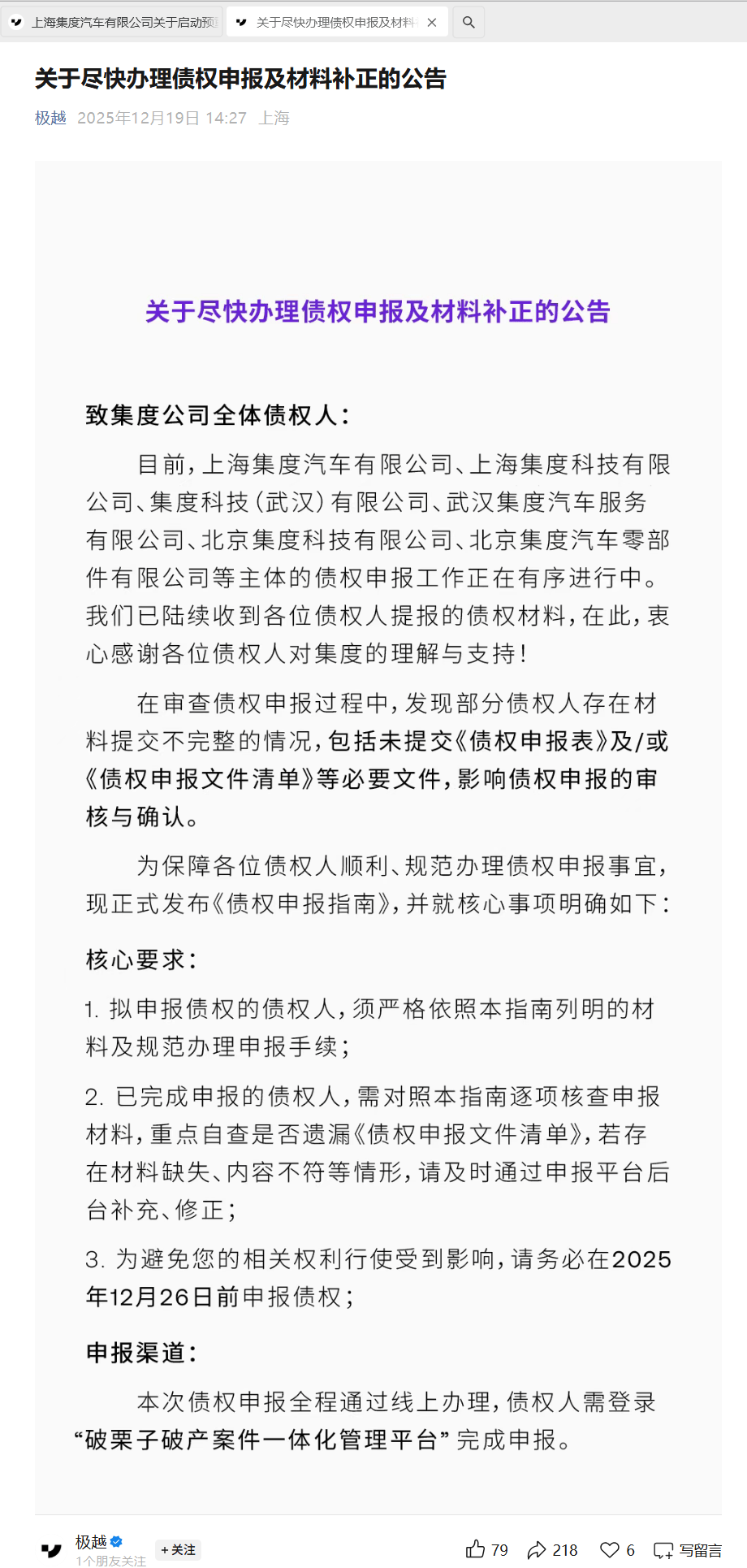 目前,债权申报工作正在紧锣密鼓地进行中。极越汽车方面表示,部分债权人在提交资料时存在不完整的情况,需要严格按照《债权申报指南》的要求进行补充和修正。所有债权人需在2025年12月26日前完成申报工作,以确保自身权益得到妥善处理。同时,极越汽车承诺将在临时管理人的监督下,维持核心业务的正常运转,全力保障用户的合法权益。