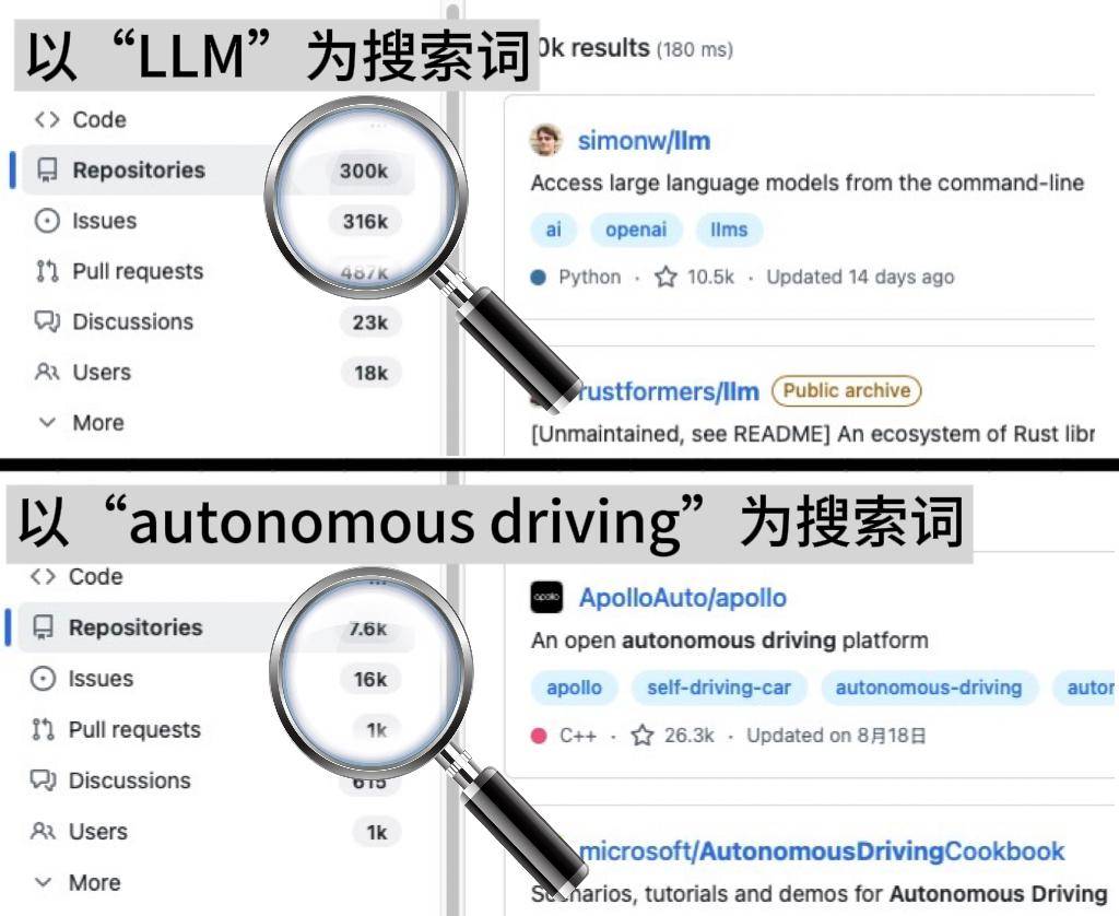 在智能驾驶领域,开源与闭源的技术路线之争持续引发关注。以视觉语言动作模型(VLA)为例,不同技术路径的竞争格局正逐步显现。数据显示,以特定中文词汇为关键词的代码仓库数量达30万个,而以“autonomous driving”为关键词的代码仓库不足1万个,二者规模差距近40倍。这种差异不仅体现在开源生态的活跃度上,更折射出全球技术发展的地域性特征。