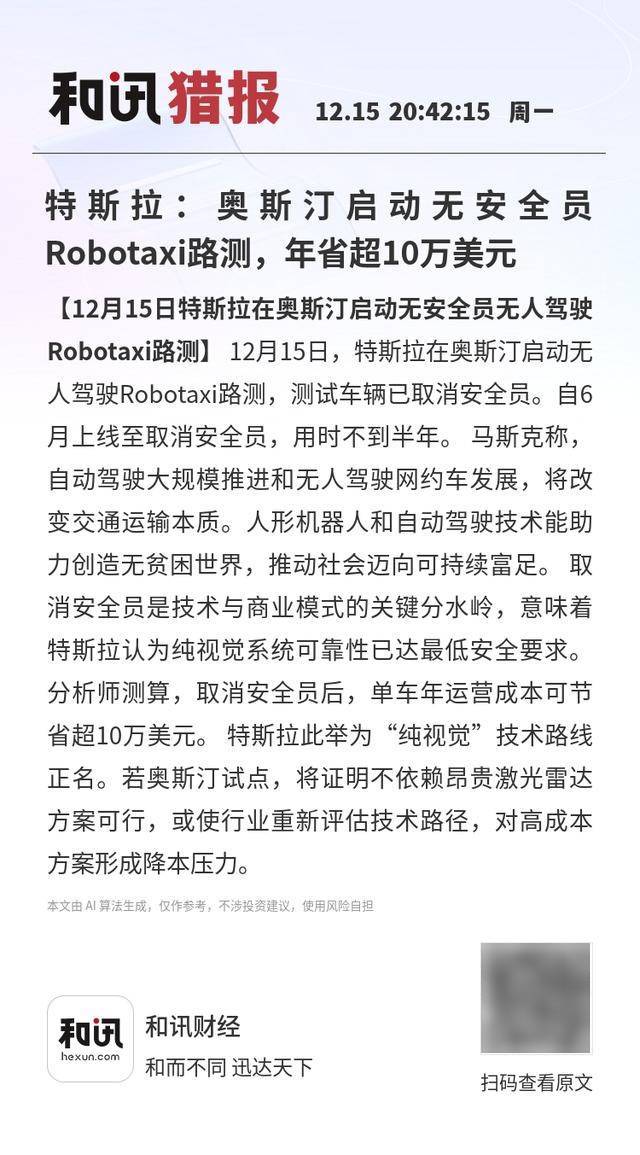 特斯拉近日在得克萨斯州奥斯汀市迈出自动驾驶商业化关键一步——其Robotaxi(无人驾驶网约车)测试车辆正式取消车内安全员配置。这一突破性进展距离该服务6月首次上线不足半年,标志着特斯拉纯视觉自动驾驶方案进入规模化验证阶段。据行业分析师测算,此举将使单车年度运营成本削减超10万美元,为自动驾驶技术商业化按下加速键。