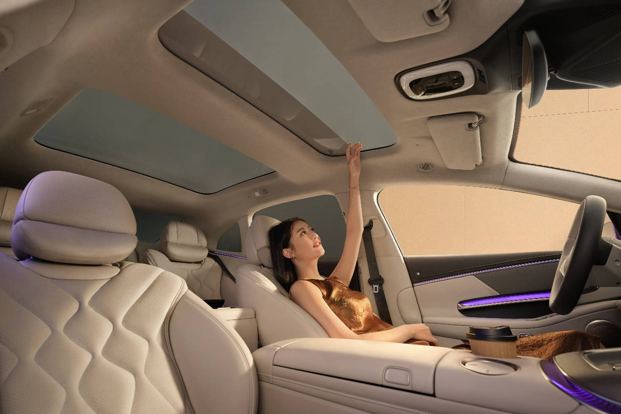 设计语言上,东方美学与未来科技达成微妙平衡。532mm的车身高度与1.31倍宽高比,既保留了行政轿车的庄重感,又通过全球首创的三面式翻转大灯赋予车辆“表情交互”能力。内饰空间中,30年陈花曲柳木饰板与超柔Nappa真皮形成材质对话,6536mm月晕氛围灯带则将座舱化为流动的艺术空间。针对中国用户需求开发的2+1变形座椅,可秒变零重力模式的副驾,以及支持三温区控制的智能冰箱,让豪华从视觉体验延伸至五感沉浸。